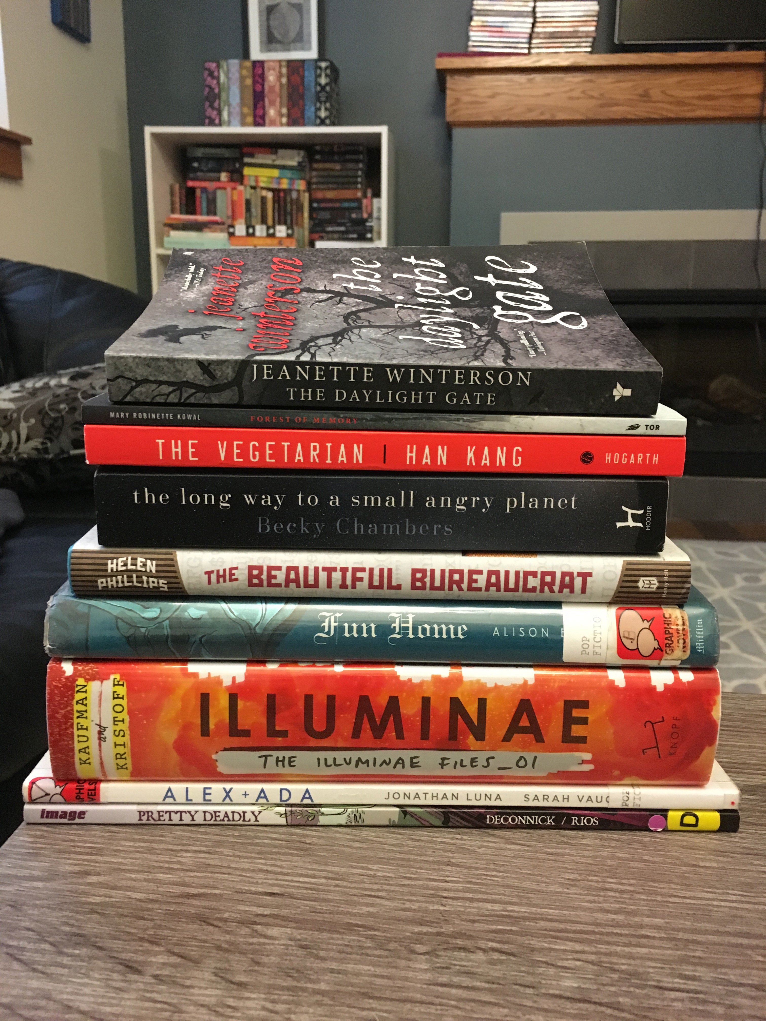 Beyond that, I’m also planning on taking part in the Tome Topple challenge, which takes place during the last two weeks of November (Nov 18-Dec 1). This challenge is sort of a response to all of the readathons where your goal is to read as many books as possible (which many people respond to by reading lots of really short works and graphic novels) and the goal is to tackle books over 500 pages. It’s nice because it’s very low-pressure; you’re aiming to read as much of one of those giant books as you can, and if you don’t end up finishing a book during the challenge, that’s OK. I personally love really long books, and this challenge is giving me an extra push to try and read one or two before the end of the year. I’ve been thinking that I’d really like to read 1Q84 before 2016 is up, but I have a lot of other options; The Bone Clocks is another strong contender. I’m going to hold off on setting an official TBR for this readathon because it’s not until the end of the month and I’m expecting a new tome in the mail before then (the first book in the Mistborn trilogy) which might demand me to read it immediately.