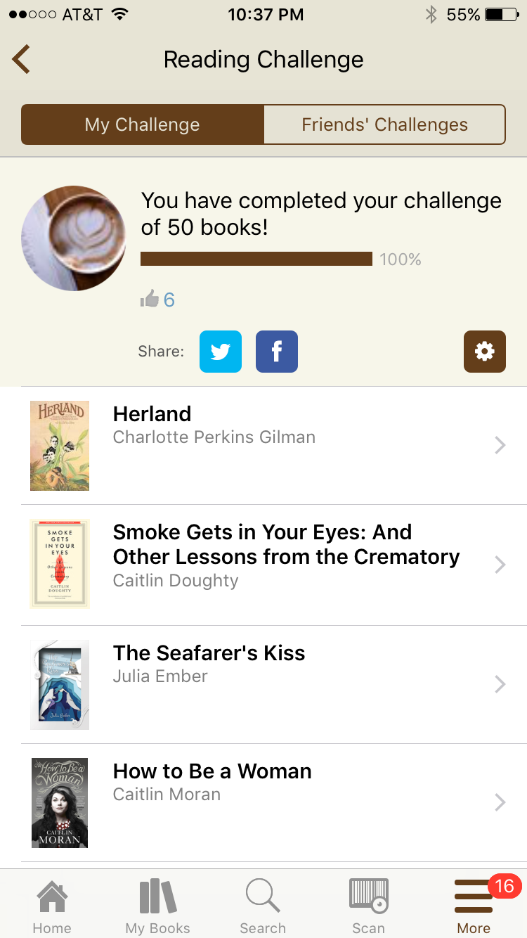 So, in addition to my stated goals from the beginning of the year, I also have a few “secret goals,” which are reading goals that either seem silly or unrealistic so I didn’t write them down. The first of these goals was to read 100 books, which I’ve never before been able to accomplish in a year. I didn’t want to make this an “official” reading goal, because I didn’t want to put pressure on myself and dissuade myself from picking up longer reads when I’m in the mood for them. Since I’m already at 50 books, though, I may just make it.